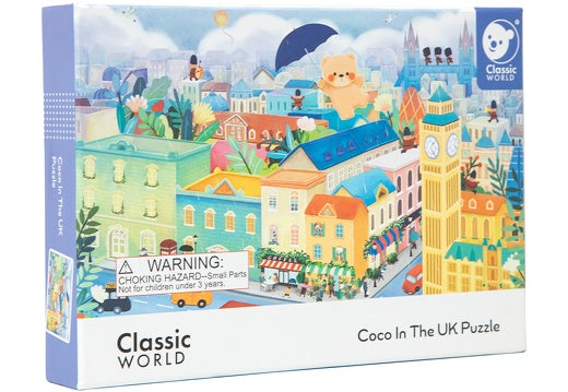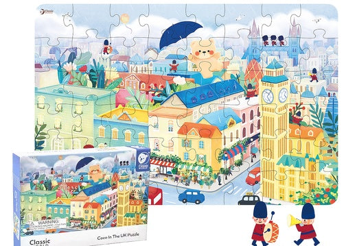 Ταξίδι στην Βρετανία. Ένα παζλ στο οποίο ο COCO ταξιδεύει με μια ομπρέλα πάνω από το BIG BEN , το κόκκινο διώροφο λεωφορείο και πολλά ακόμα.