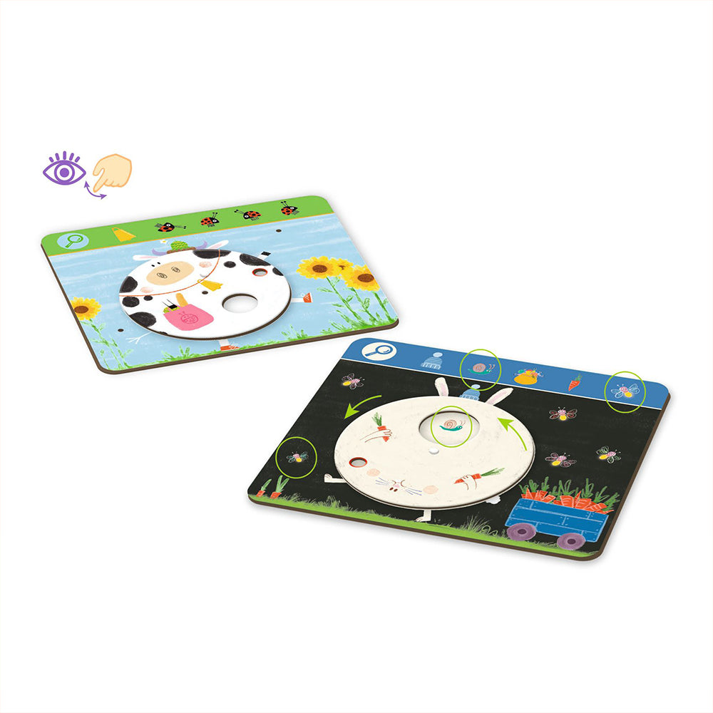 Ένα πρωτότυπο παιχνίδι παρατηρητικότητας από την εταιρεία Djeco γεμάτο δράση, ανακαλύψεις και διασκέδαση! Με 6 διαδραστικές καρτέλες και περιστρεφόμενα στοιχεία, το παιδί καλείται να εντοπίσει αντικείμενα και ζώα που «κρύβονται» μέσα στις εικόνες. Οι σκηνές ζωντανεύουν στα χέρια του, μετατρέποντας το παιχνίδι σε μια καθηλωτική εμπειρία εξερεύνησης. Καθώς το παιδί γυρίζει, αγγίζει και παρατηρεί τις κινητές λεπτομέρειες, ενισχύει τη λεπτή κινητικότητα και τον συντονισμό χεριού-ματιού. Παράλληλα, εξασκεί τη συγκέντρωση, την αναλυτική σκέψη και την ικανότητα να αναγνωρίζει σχήματα, χρώματα και αντικείμενα μέσα σε πολυσύνθετες εικόνες. Το παιχνίδι είναι κατάλληλο για ένα παίκτη και προσφέρει ποιοτικό χρόνο απασχόλησης, είτε στο σπίτι είτε εν κινήσει. Ένα παιχνίδι παρατήρησης με αστείες εικονογραφήσεις ζώων, που συνδυάζει τη διασκέδαση με την εκπαίδευση, ενθαρρύνοντας το παιδί να ανακαλύψει, να αγγίξει και να εξερευνήσει τον κόσμο γύρω του.