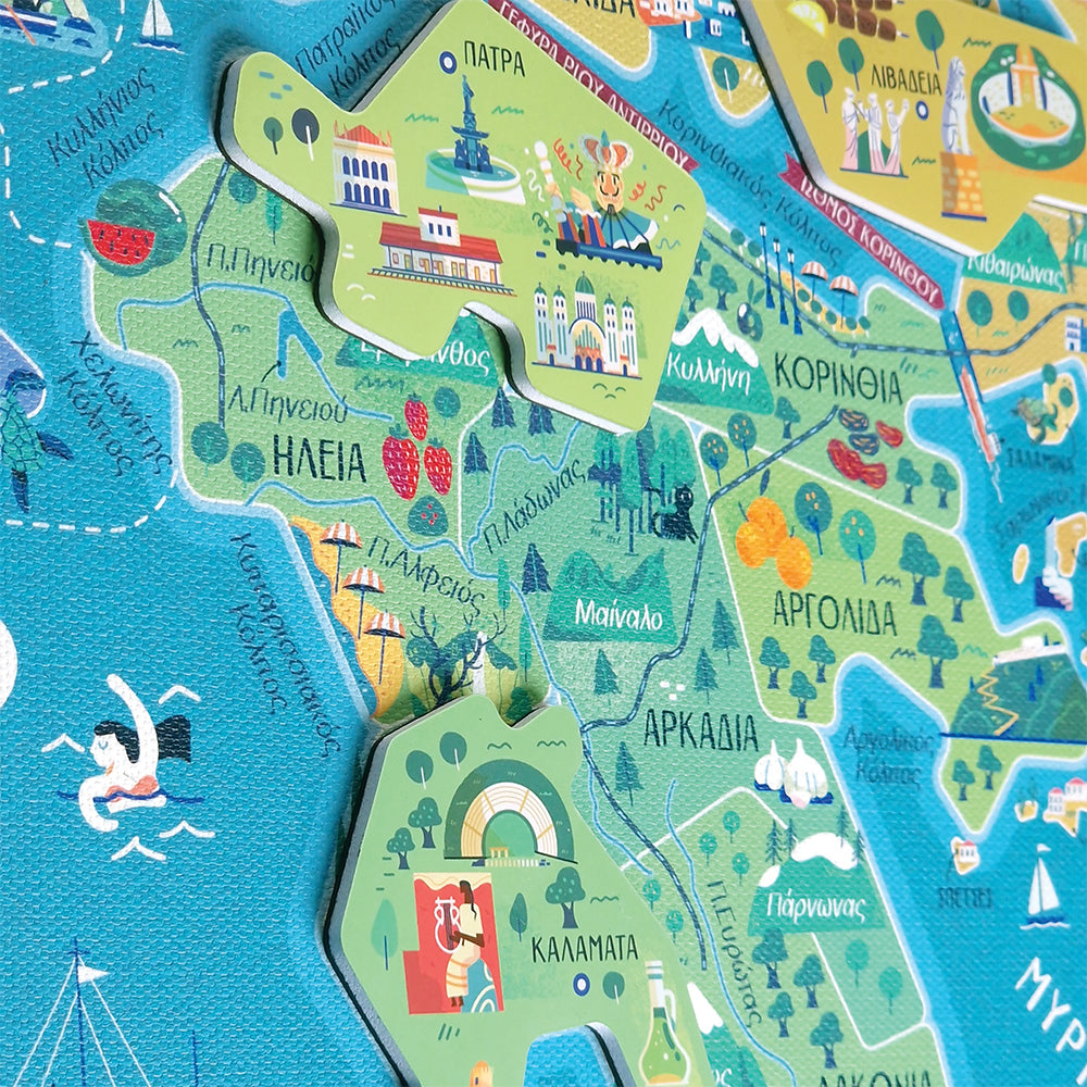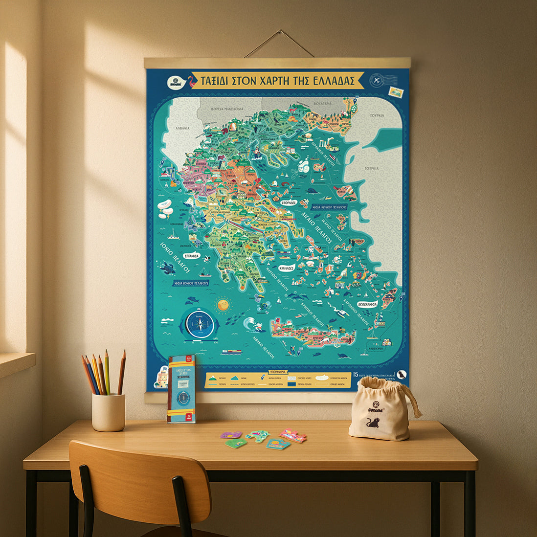 «Ταξίδι στον χάρτη της Ελλάδας» - ένας συναρπαστικός Χάρτης – μαγνητικό Παζλ από την εταιρία Svoora! Iδανικός συνδυασμός διασκέδασης και μάθησης για εσάς και την οικογένειά σας! Με μια εντυπωσιακή εικονογράφηση γεμάτη γεωμορφολογικά στοιχεία – βουνά, ποτάμια, λίμνες – και μαγνητάκια που αναδεικνύουν τοπικά προϊόντα, αξιοθέατα και έθιμα, σας προσκαλεί να γνωρίσετε τη μοναδική γεωγραφία και πολιτιστική κληρονομιά της χώρας μας. Εξερευνήστε κάθε νομό, απολαμβάνοντας τις φυσικές ομορφιές και τα πολιτιστικά χαρακτηριστικά του. Διαθέτει πυξίδα, υπόμνημα και γραφική κλίμακα για εύκολο προσανατολισμό, ώστε να κατανοείτε αποστάσεις και τοποθεσίες. Κάντε την εμπειρία σας ακόμα πιο συναρπαστική, ανακαλύπτοντας 15 κρυμμένες γάτες στις εικόνες του! Με τους δύο μεγεθυντικούς φακούς που περιλαμβάνονται, μπορείτε να εστιάσετε σε μικρές λεπτομέρειες, να δείτε αξιοθέατα από κοντά και να γίνετε αληθινοί εξερευνητές! Ζήστε τη μαγεία της Ελλάδας μέσα από αυτό το άκρως εκπαιδευτικό και διασκεδαστικό ταξίδι – ένα παιχνίδι γεμάτο γνώσεις, περιπέτεια και διασκέδαση για μικρούς και μεγάλους!