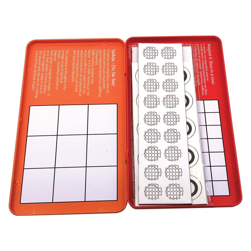 Το κλασσικό επιτραπέζιο παιχνίδι σε μαγνητική μορφή και σε συσκευασία ταξιδίου. Περιλαμβάνονται οδηγίες στα ελληνικά και στα αγγλικά. Η συσκευασία περιέχει τα 2 πολύ γνωστά παιχνίδια 'Τρίλιζα και 4 στην Σειρά'. Κατάλληλο από 4 ετών και άνω. Διαστάσεις συσκευασίας: 18,5x10,5x1 εκ.
